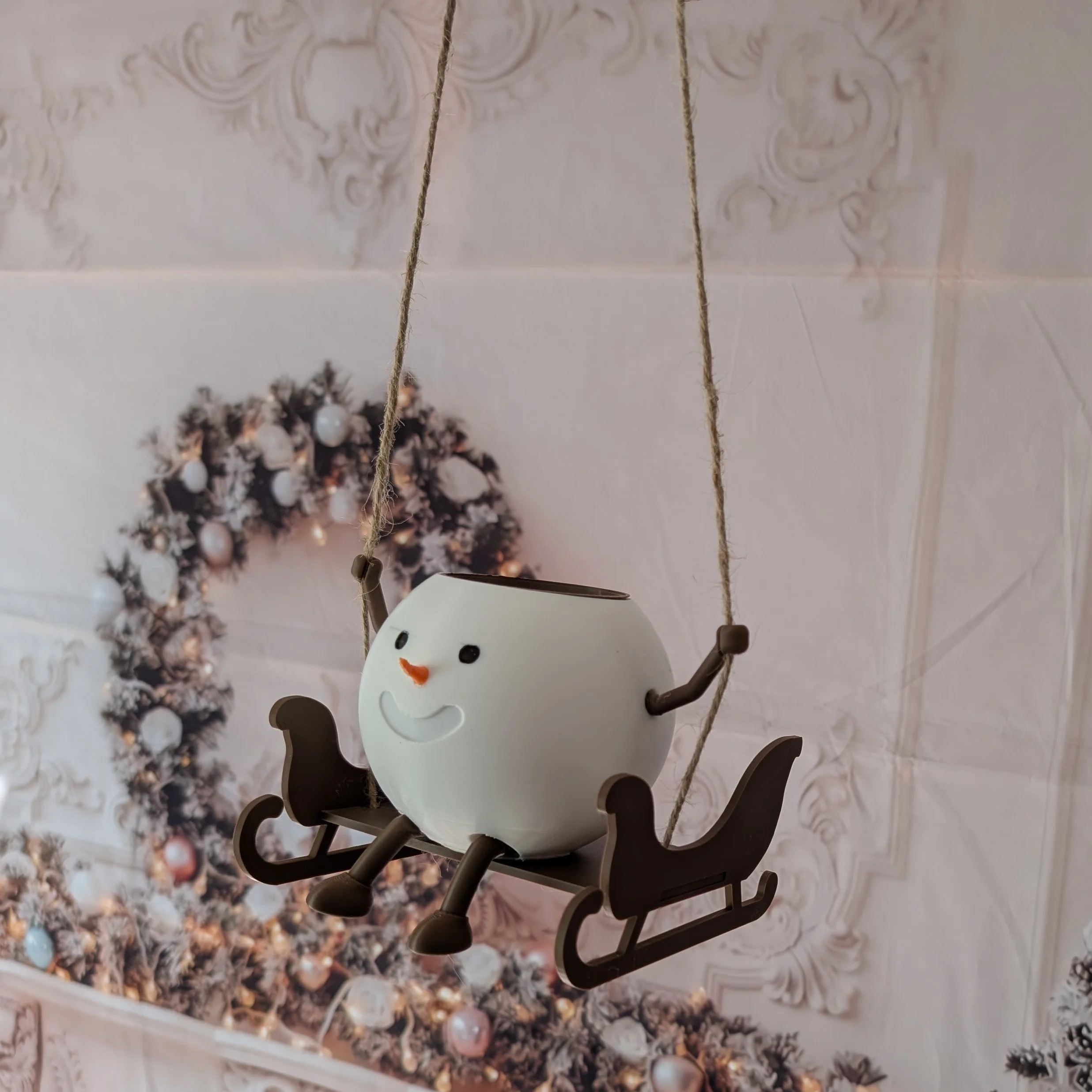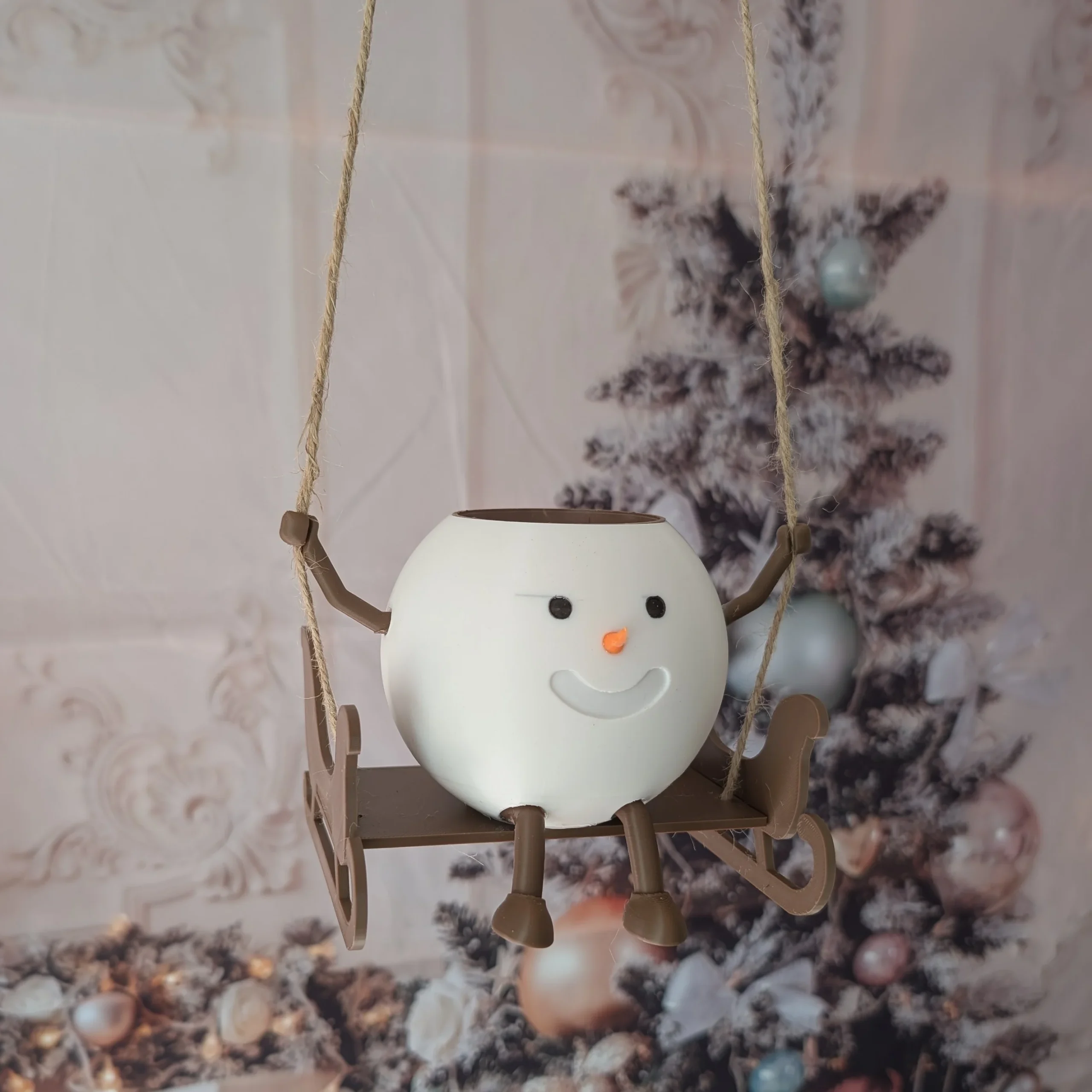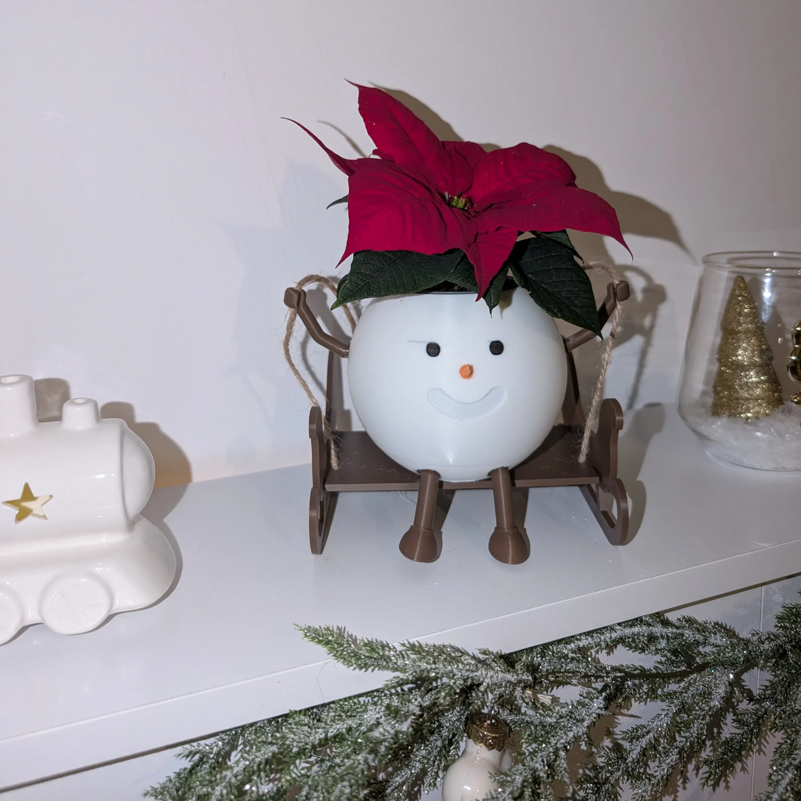 Le corps du bonhomme de neige est imprimé en 3D en PLA (plastique à partir d’amidon de maïs) et son traineau est réalisé en bois. Vendu sans plante.